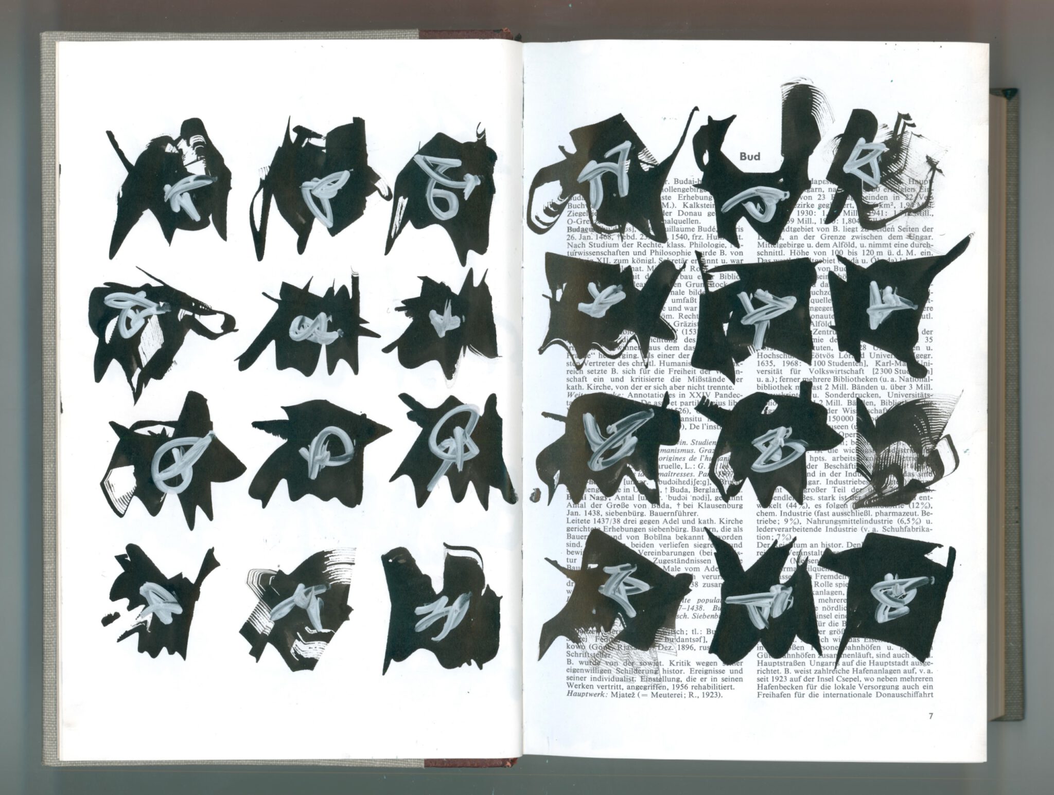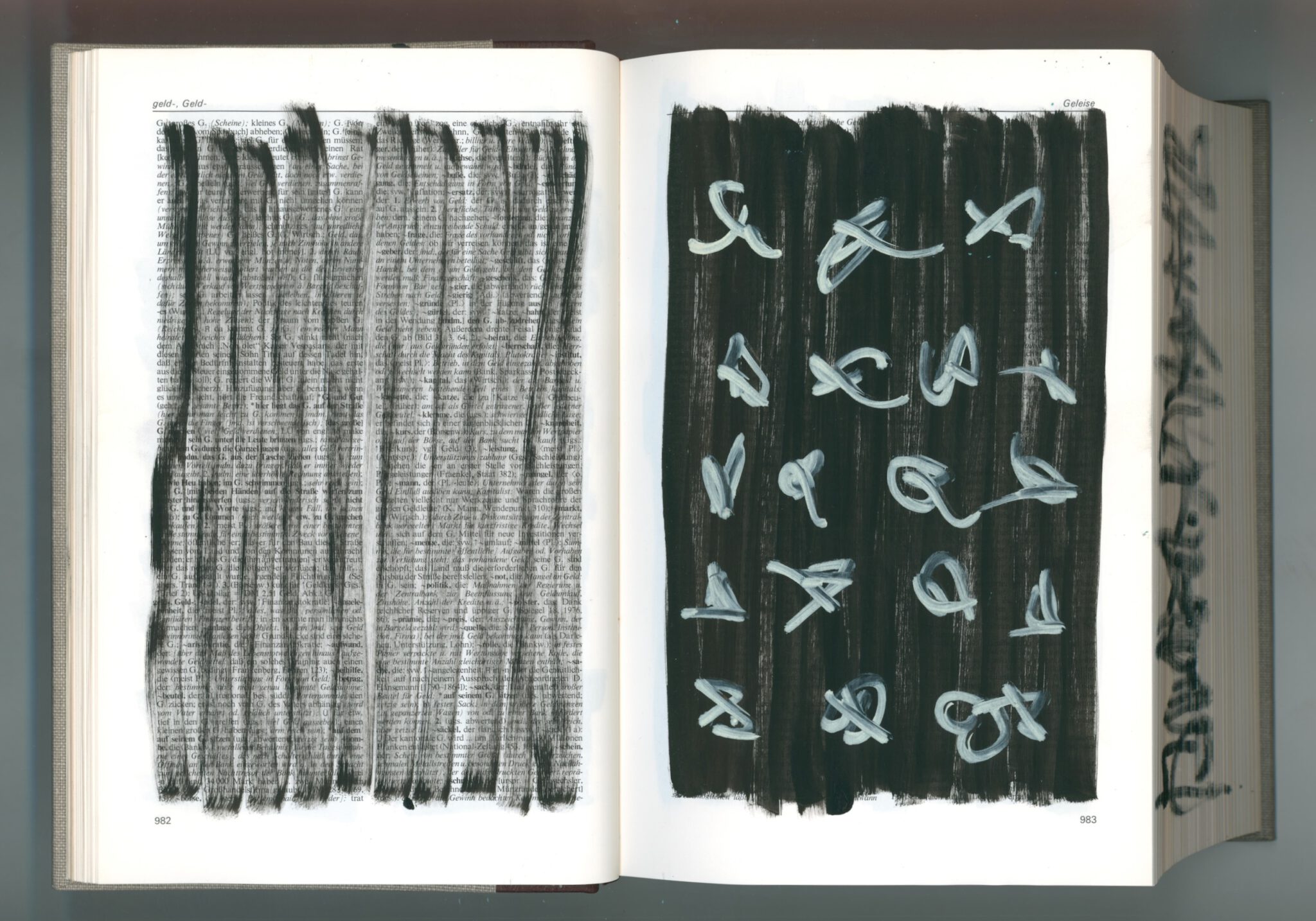 Beschriftung einer Säule im Lesesaal der Bibliothek, Acryltinten auf weiss grundierter Betonsäule, 2023