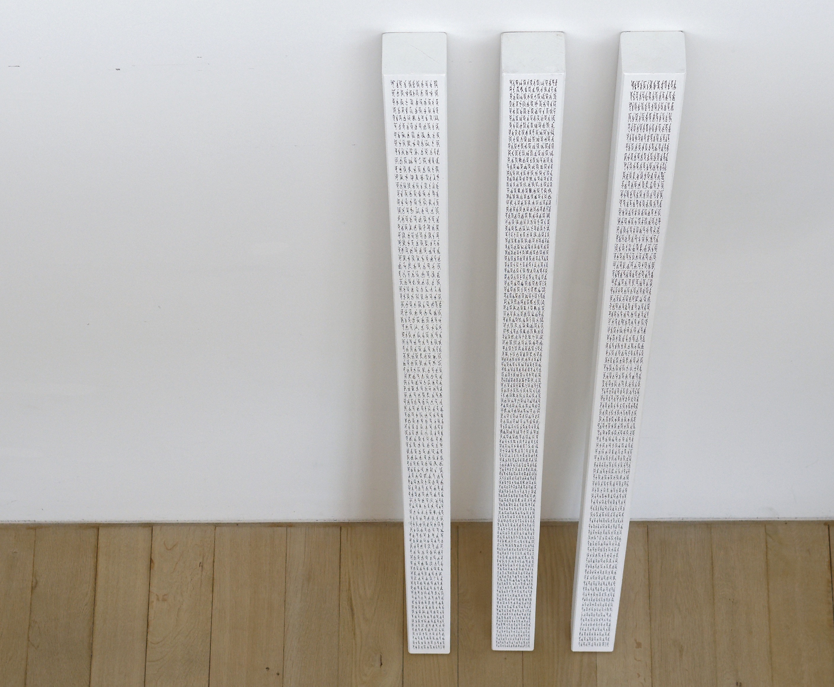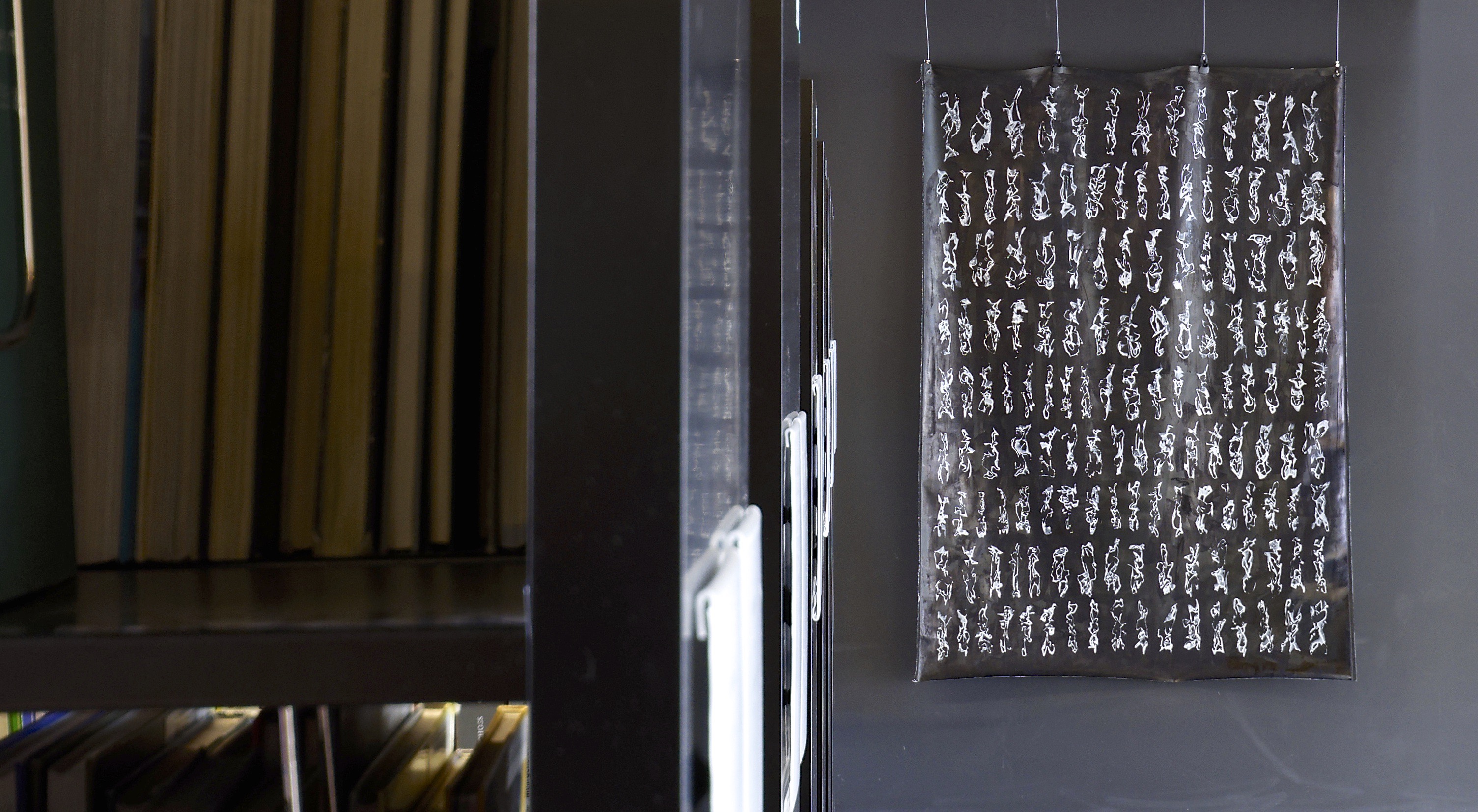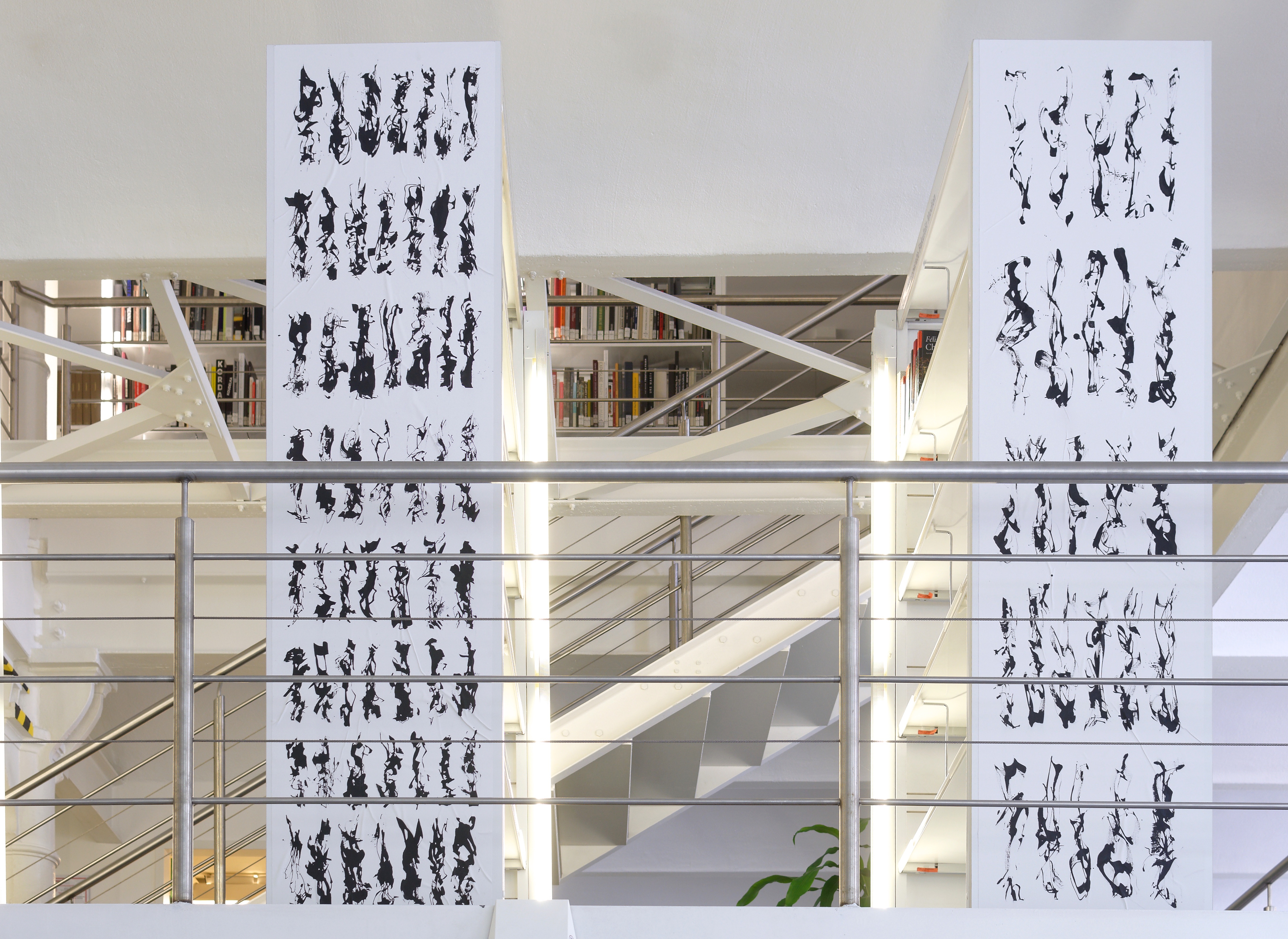 'Hemd des Bibliothekars', Acryl / synthetisches Bitumen auf Trevira, ca 560 x 325 cm, 2017 Ausschnitt: 'Hemd des Bibliothekars', Acryl / synthetisches Bitumen auf Trevira, ca 560 x 325 cm, 2017 Ausschnitt: Stelen, Acryl auf Holz, je 225 x 9,5 x 8,5 cm Stelen, Acryl auf Holz, je 225 x 9,5 x 8,5 cm Tagebuch, Band 4 - Seite 2978, 2980, DIN-A4 Format, 1991 Tagebuch, Band 5 - Seite 4758, 4759, DIN-A4 Format,1992 Tagebuch, Band 7 - Seite 6019, 6020, DIN-A4 Format,1994 Rotadex, Stahlgehäuse mit 500 Karteikarten 8,9 x 5,2 cm, 2017 Rotadex, Stahlgehäuse mit 500 Karteikarten 8,9 x 5,2 cm, 2017 (Foto: Thomas Müller) Rotadex, Stahlgehäuse/Eisengestell, 500 Karteikarten 8,9 x 5,2 cm, 2017 Hinweisschilder, je 65 x 23 cm, 2017 Einzelzeichen auf Glas, 2017 Einzelzeichen auf Beton, 2017 Einzelzeichen auf Beton, 2017 Einzelzeichen auf Glas, 2017 Einzelzeichen auf Beton, 2017 Einzelzeichen auf Beton, 2017 Einzelzeichen auf Glas, 198 x 55 cm, 2017 Einzelzeichen auf Glas, 198 x 55 cm, 2017 Einzelzeichen auf Glas, 198 x 55 cm, 2017 Palimpsest, Eco-Solvent Tinte auf LKW-Plane, 137 x 205 cm, 2017 Palimpsest, Eco-Solvent Tinte auf LKW-Plane, 137 x 205 cm, 2017 Palimpsest 001, und 002, Eco-Solvent Tinte auf LKW-Plane, je 137 x 205 cm, 2017 Palimpsest 004, und003, Eco-Solvent Tinte auf LKW-Plane, je 137 x 205 cm, 2017 Ausschnitt: Palimpsest 001, Eco-Solvent Tinte auf LKW-Plane, 137 x 205 cm, 2017 Ausschnitt: Palimpsest-004, Eco-Solvent Tinte auf LKW-Plane, 137 x 205 cm, 2017 Nr.1599, Acryl auf Leinwand, 160 x 190 cm, 2017 Nr.1599, Acryl auf Leinwand, 160 x 190 cm, 2017 Ausschnitt: Nr.1599, Acryl auf Leinwand, 160 x 190 cm, 2017 Nr.1599, Acryl auf Leinwand, 160 x 190 cm, 2017 Nr. 1602, Acryl auf Leinwand, 160 x 220 cm, 2017 Ausschnittl: Nr. 1602, Acryl auf Leinwand, 160 x 220 cm, 2017 Nr. 1601 und Nr. 1602, Acryl auf Leinwand, je 160 x 220 cm, 2017 Bibliothek der unlesbaren Zeichen, Acryl auf Leinwand, je 50 x 200 cm, 2017 Bibliothek der unlesbaren Zeichen, Acryl auf Leinwand, je 50 x 200 cm, 2017 Einzelzeichen auf Glas, je ca. 175 x 50 cm, 2017 (Foto: Thomas Müller) Schreib-Performance, Audimax der Bauhaus-Universität, 2017 (Foto: Thomas Müller) Schreib-Performance, Audimax der Bauhaus-Universität, 2017 (Foto: Thomas Müller)