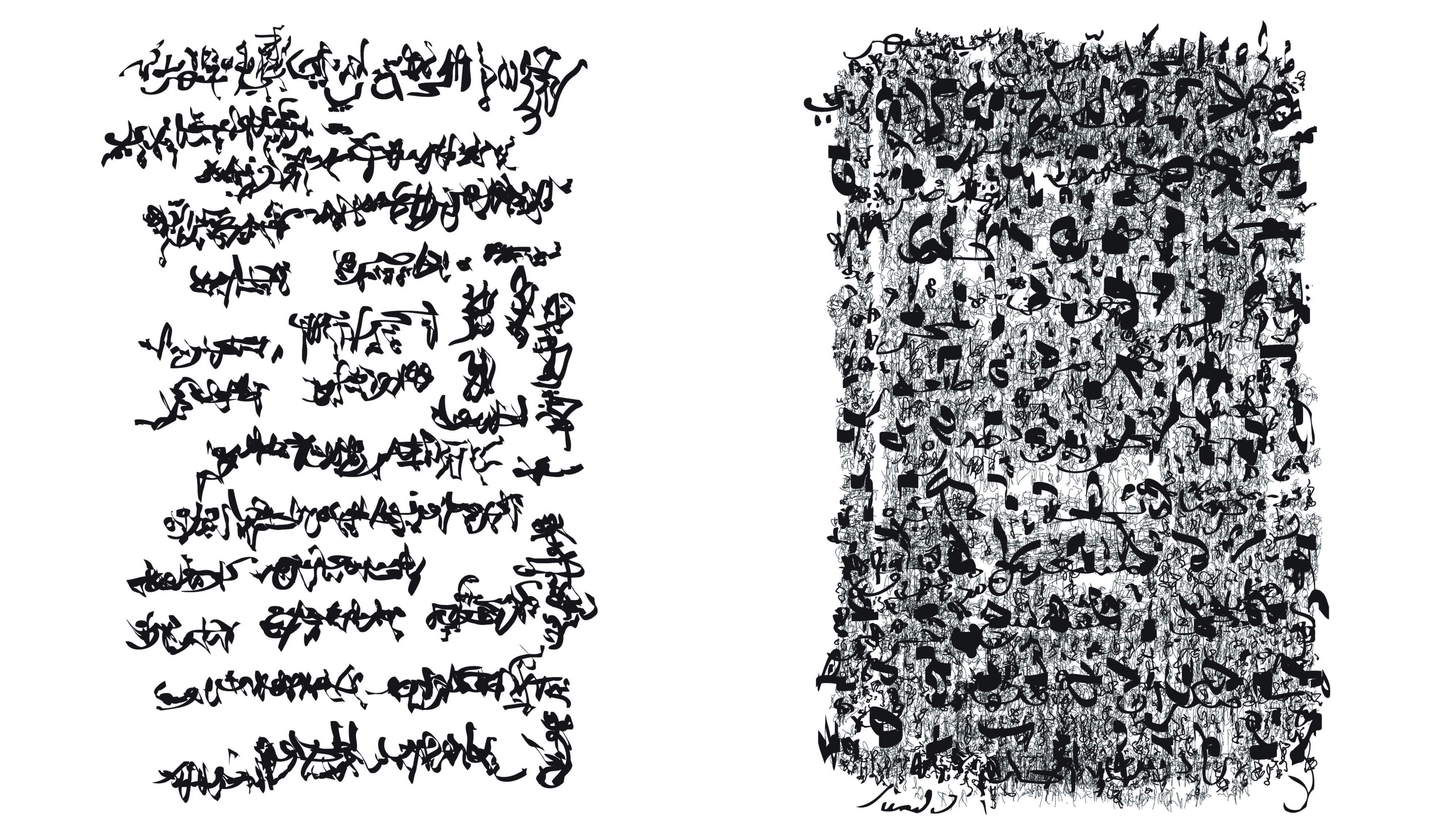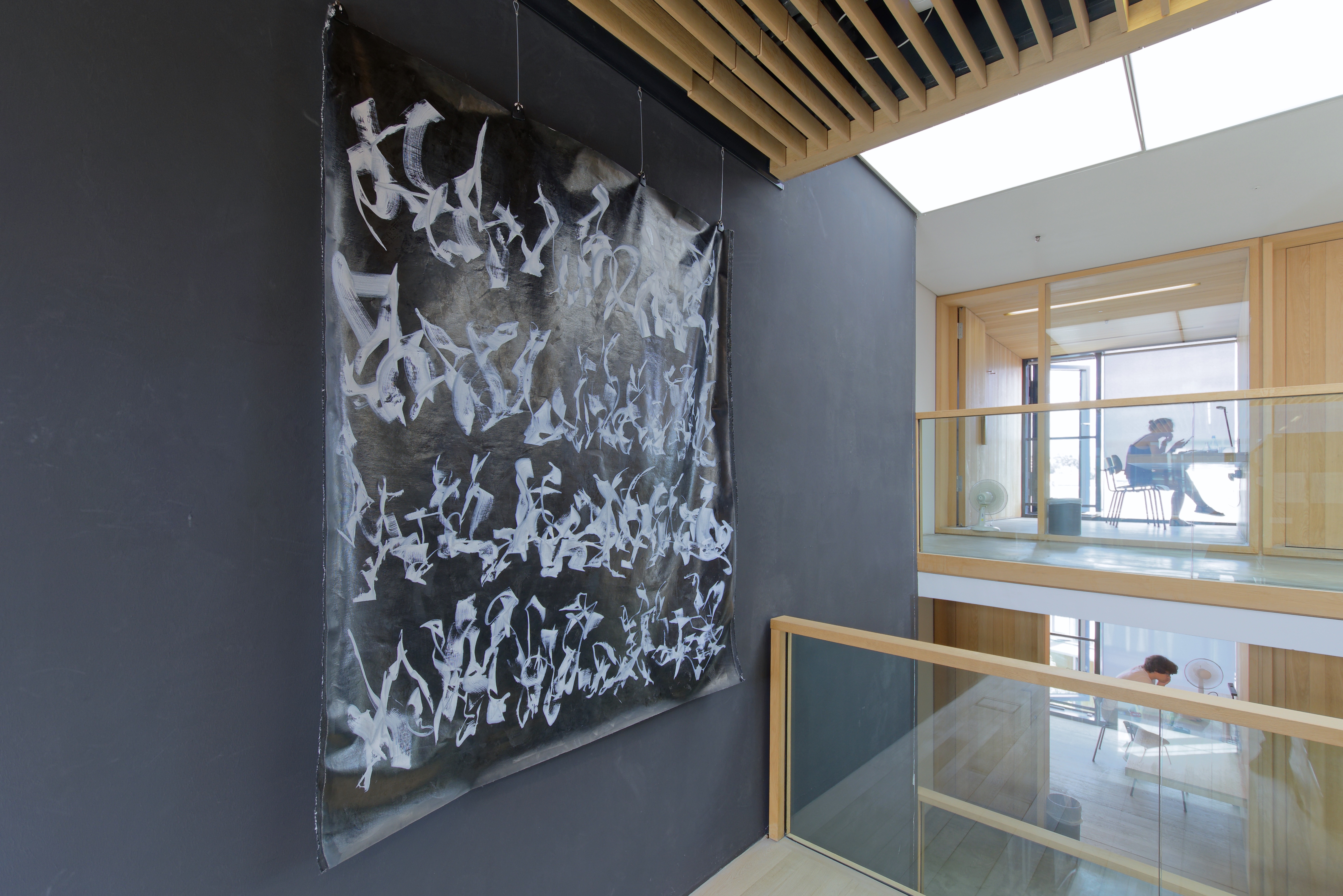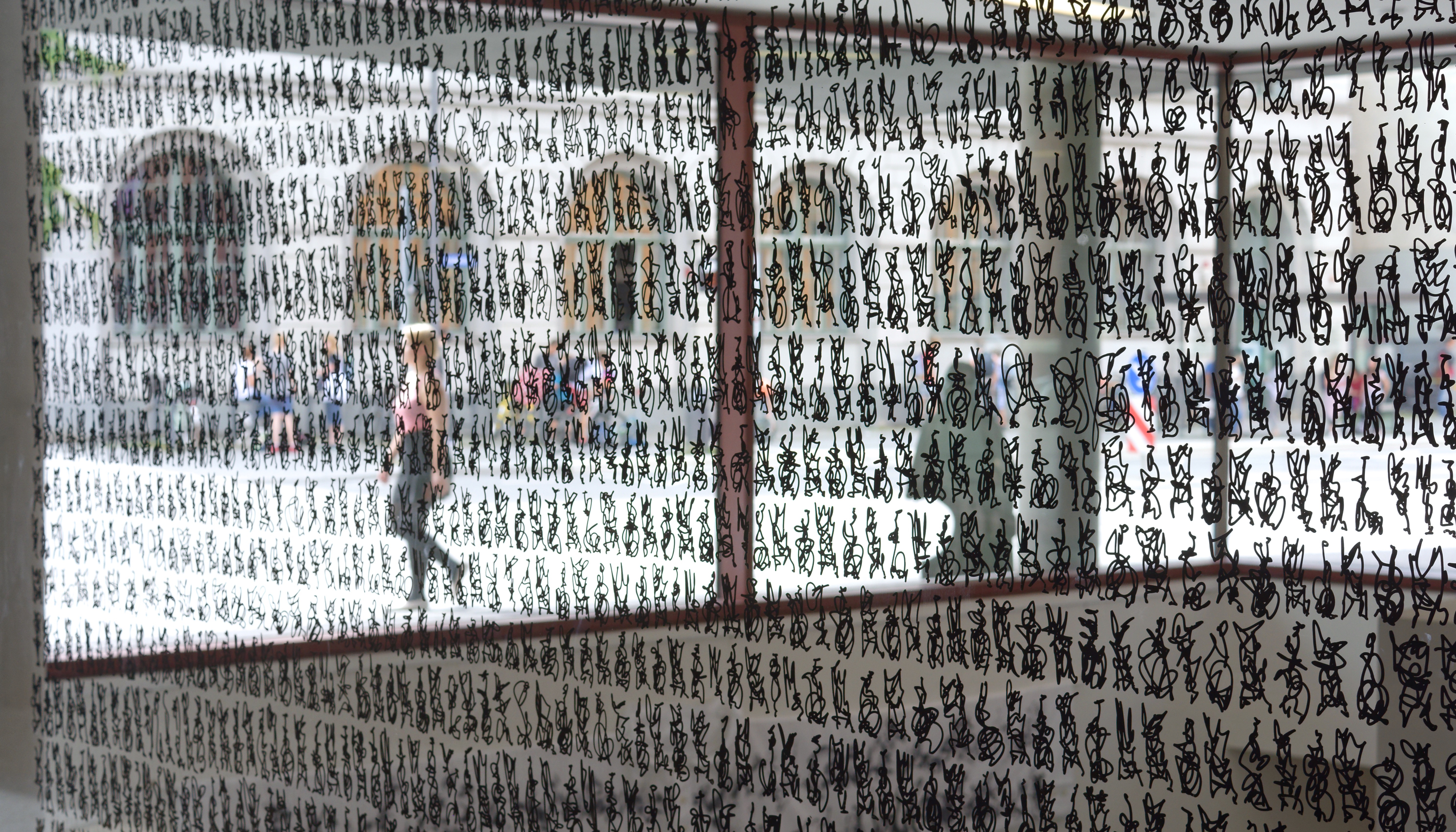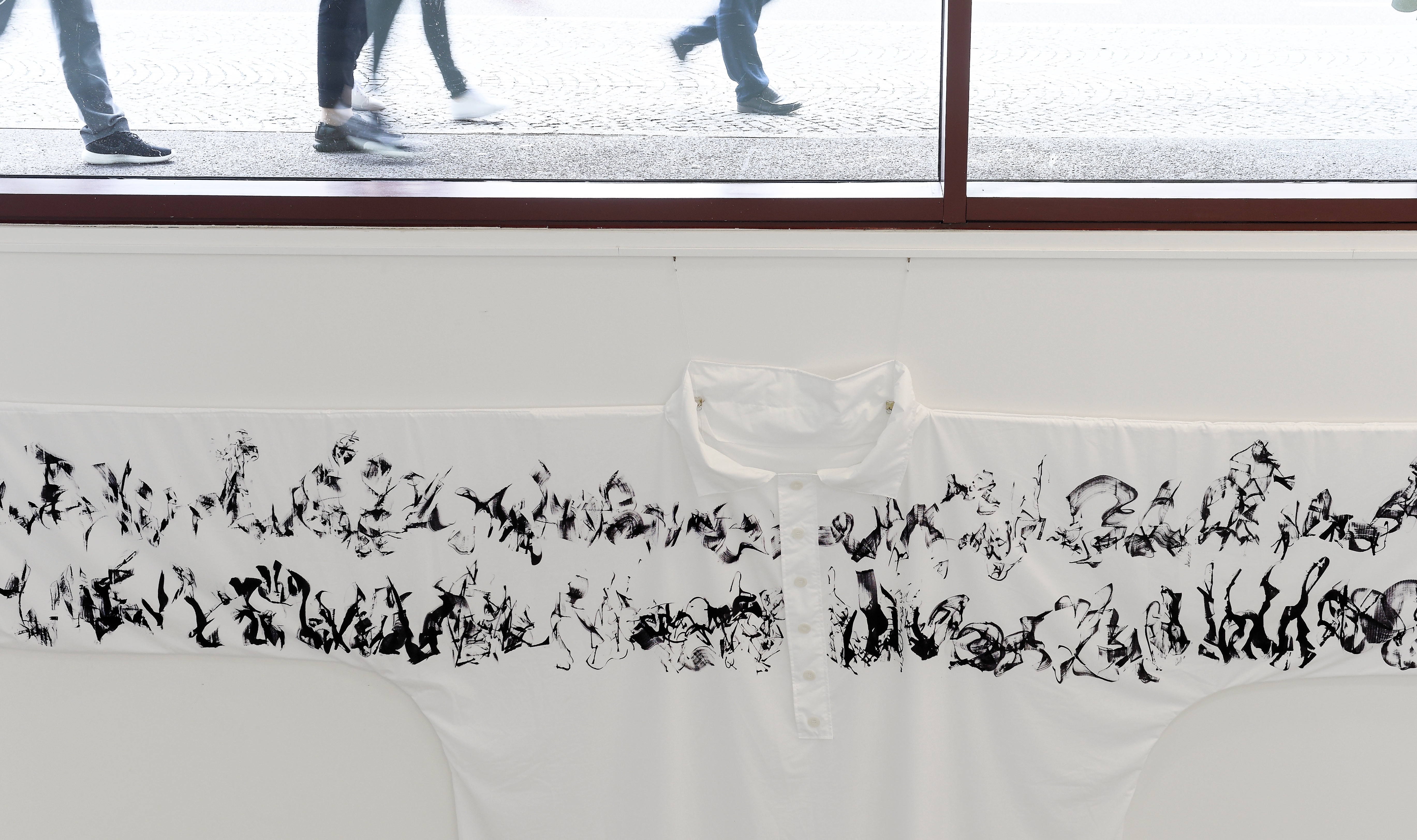 'Hemd des Bibliothekars', Acryl / synthetisches Bitumen auf Trevira, ca 560 x 325 cm, 2017 Ausschnitt: 'Hemd des Bibliothekars', Acryl / synthetisches Bitumen auf Trevira, ca 560 x 325 cm, 2017 Ausschnitt: Stelen, Acryl auf Holz, je 225 x 9,5 x 8,5 cm Stelen, Acryl auf Holz, je 225 x 9,5 x 8,5 cm Tagebuch, Band 4 - Seite 2978, 2980, DIN-A4 Format, 1991 Tagebuch, Band 5 - Seite 4758, 4759, DIN-A4 Format,1992 Tagebuch, Band 7 - Seite 6019, 6020, DIN-A4 Format,1994 Rotadex, Stahlgehäuse mit 500 Karteikarten 8,9 x 5,2 cm, 2017 Rotadex, Stahlgehäuse mit 500 Karteikarten 8,9 x 5,2 cm, 2017 (Foto: Thomas Müller) Rotadex, Stahlgehäuse/Eisengestell, 500 Karteikarten 8,9 x 5,2 cm, 2017 Hinweisschilder, je 65 x 23 cm, 2017 Einzelzeichen auf Glas, 2017 Einzelzeichen auf Beton, 2017 Einzelzeichen auf Beton, 2017 Einzelzeichen auf Glas, 2017 Einzelzeichen auf Beton, 2017 Einzelzeichen auf Beton, 2017 Einzelzeichen auf Glas, 198 x 55 cm, 2017 Einzelzeichen auf Glas, 198 x 55 cm, 2017 Einzelzeichen auf Glas, 198 x 55 cm, 2017 Palimpsest, Eco-Solvent Tinte auf LKW-Plane, 137 x 205 cm, 2017 Palimpsest, Eco-Solvent Tinte auf LKW-Plane, 137 x 205 cm, 2017 Palimpsest 001, und 002, Eco-Solvent Tinte auf LKW-Plane, je 137 x 205 cm, 2017 Palimpsest 004, und003, Eco-Solvent Tinte auf LKW-Plane, je 137 x 205 cm, 2017 Ausschnitt: Palimpsest 001, Eco-Solvent Tinte auf LKW-Plane, 137 x 205 cm, 2017 Ausschnitt: Palimpsest-004, Eco-Solvent Tinte auf LKW-Plane, 137 x 205 cm, 2017 Nr.1599, Acryl auf Leinwand, 160 x 190 cm, 2017 Nr.1599, Acryl auf Leinwand, 160 x 190 cm, 2017 Ausschnitt: Nr.1599, Acryl auf Leinwand, 160 x 190 cm, 2017 Nr.1599, Acryl auf Leinwand, 160 x 190 cm, 2017 Nr. 1602, Acryl auf Leinwand, 160 x 220 cm, 2017 Ausschnittl: Nr. 1602, Acryl auf Leinwand, 160 x 220 cm, 2017 Nr. 1601 und Nr. 1602, Acryl auf Leinwand, je 160 x 220 cm, 2017 Bibliothek der unlesbaren Zeichen, Acryl auf Leinwand, je 50 x 200 cm, 2017 Bibliothek der unlesbaren Zeichen, Acryl auf Leinwand, je 50 x 200 cm, 2017 Einzelzeichen auf Glas, je ca. 175 x 50 cm, 2017 (Foto: Thomas Müller) Schreib-Performance, Audimax der Bauhaus-Universität, 2017 (Foto: Thomas Müller) Schreib-Performance, Audimax der Bauhaus-Universität, 2017 (Foto: Thomas Müller)