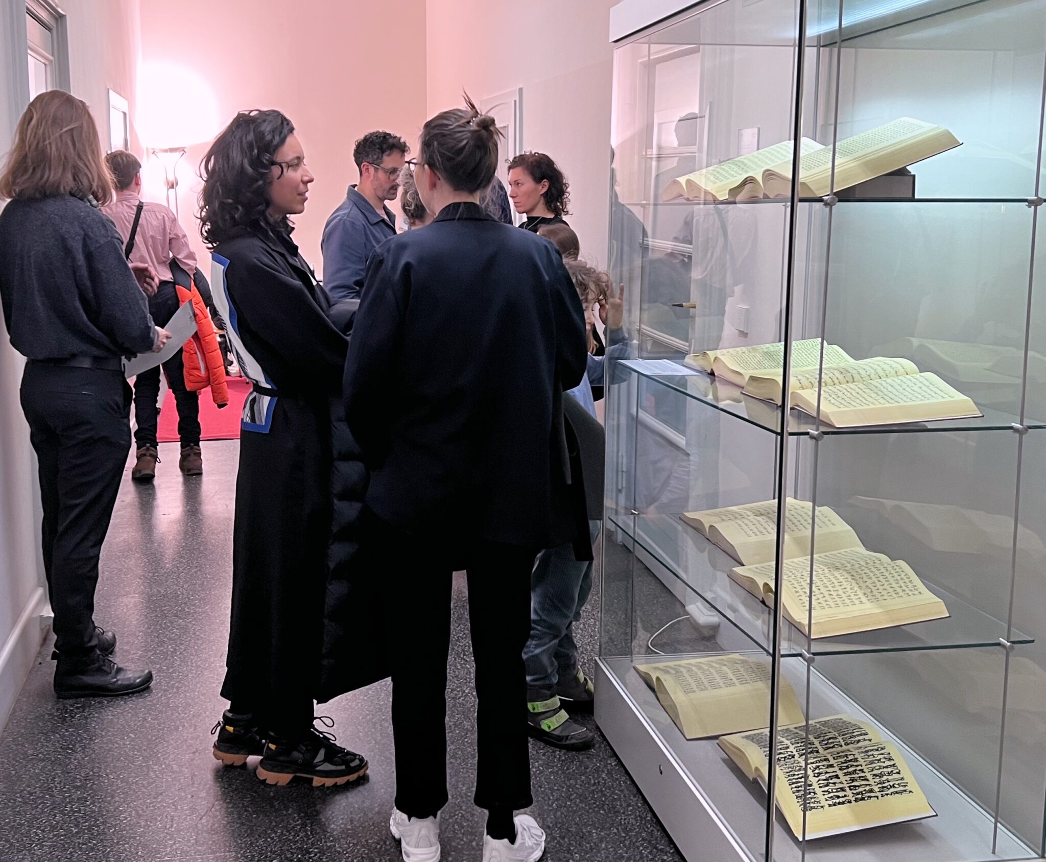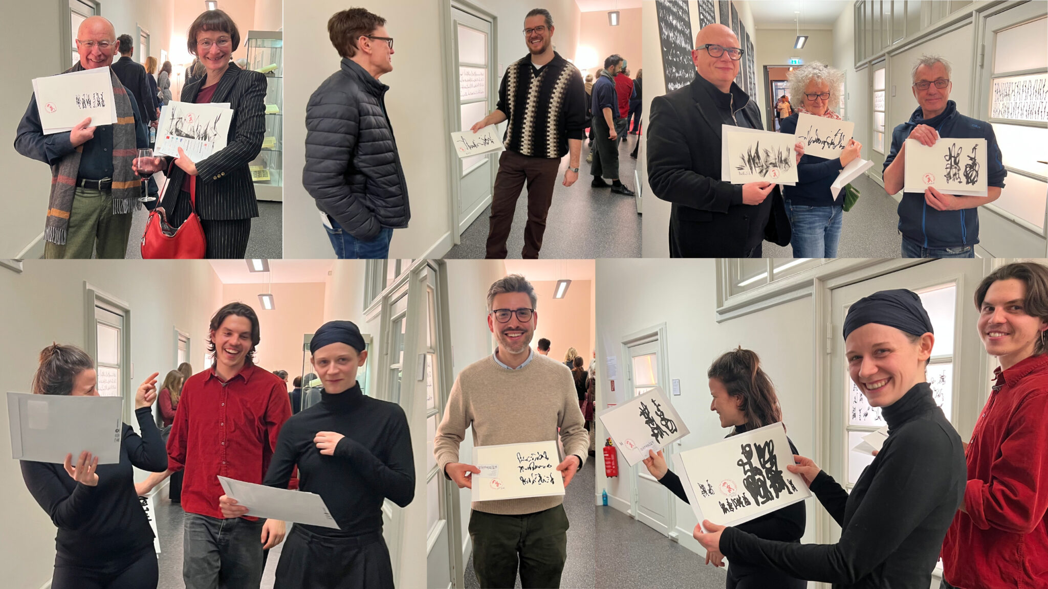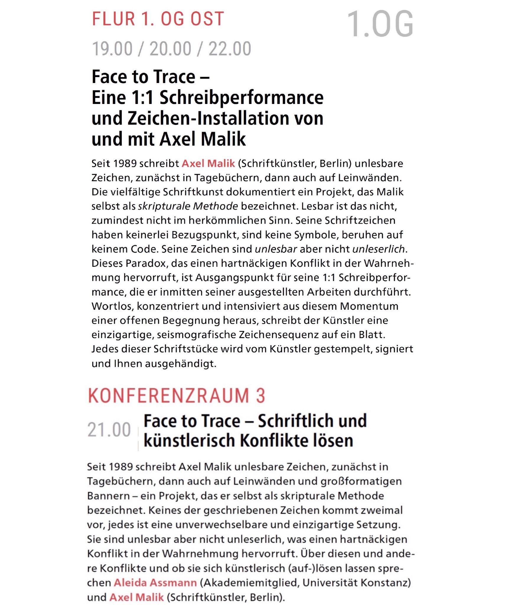Eröffnung des Salon Sophie Charlotte 2026 im Leibniz Saal der Berlin-Brandburgischen Akademie der Wissenschaften (BBAW) Programm Cover Salon Sophie Charlotte - KONFLIKTE LÖSEN - Aus dem Programm: Ankündigungstext FACE TO TRACE Flur 1. OG mit Schreibplatz, Zeichen-Texte je 230 x 70 cm, Acryl auf Tafelstoff (Blackboard), 2026 1989 begonnenes und seither fortlaufendes Buchprojekt: Tagebuch der Zeichen, hier: Bände im A4-Format 1989 begonnenes und seither fortlaufendes Buchprojekt: Tagebuch der Zeichen, Bände im A4-Format FACE TO TRACE - 1:1 Schreibperformance FACE TO TRACE - 1:1 Schreibperformance FACE TO TRACE - 1:1 Schreibperformance Unikat Schreibsequenzen, alle im DIN A4-Format, Acryl, gestempelt, datiert, signiert Rotes Warnschild mit Zeichen, 15 x 48 cm, Acryl auf weissem Karton, 2026 Rotes Warnschild mit Zeichen, 15 x 48 cm, Acryl auf weissem Karton, 2026 Türflügel 1. OG mit Zeichen, Acryl auf Glas sowie rotes Warnschild, 15 x 48 cm, Acryl auf weissem Karton, 2026 Treppenaufgang mit 4 Arbeiten 220 x 75 cm, Acryl auf Leinwand, 2024