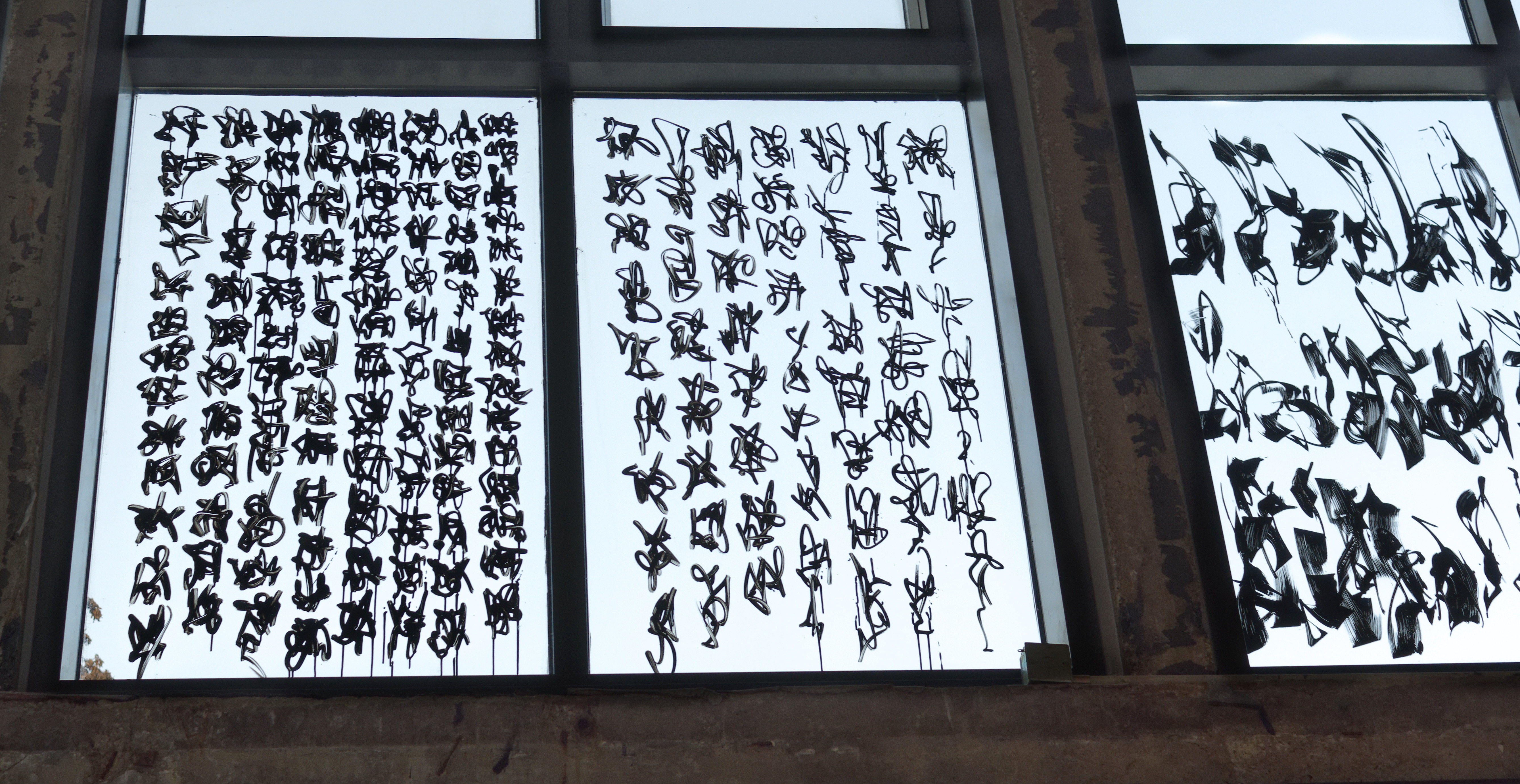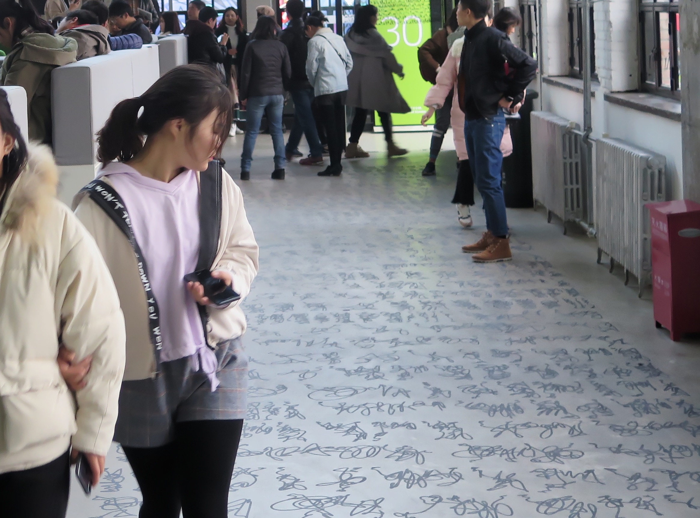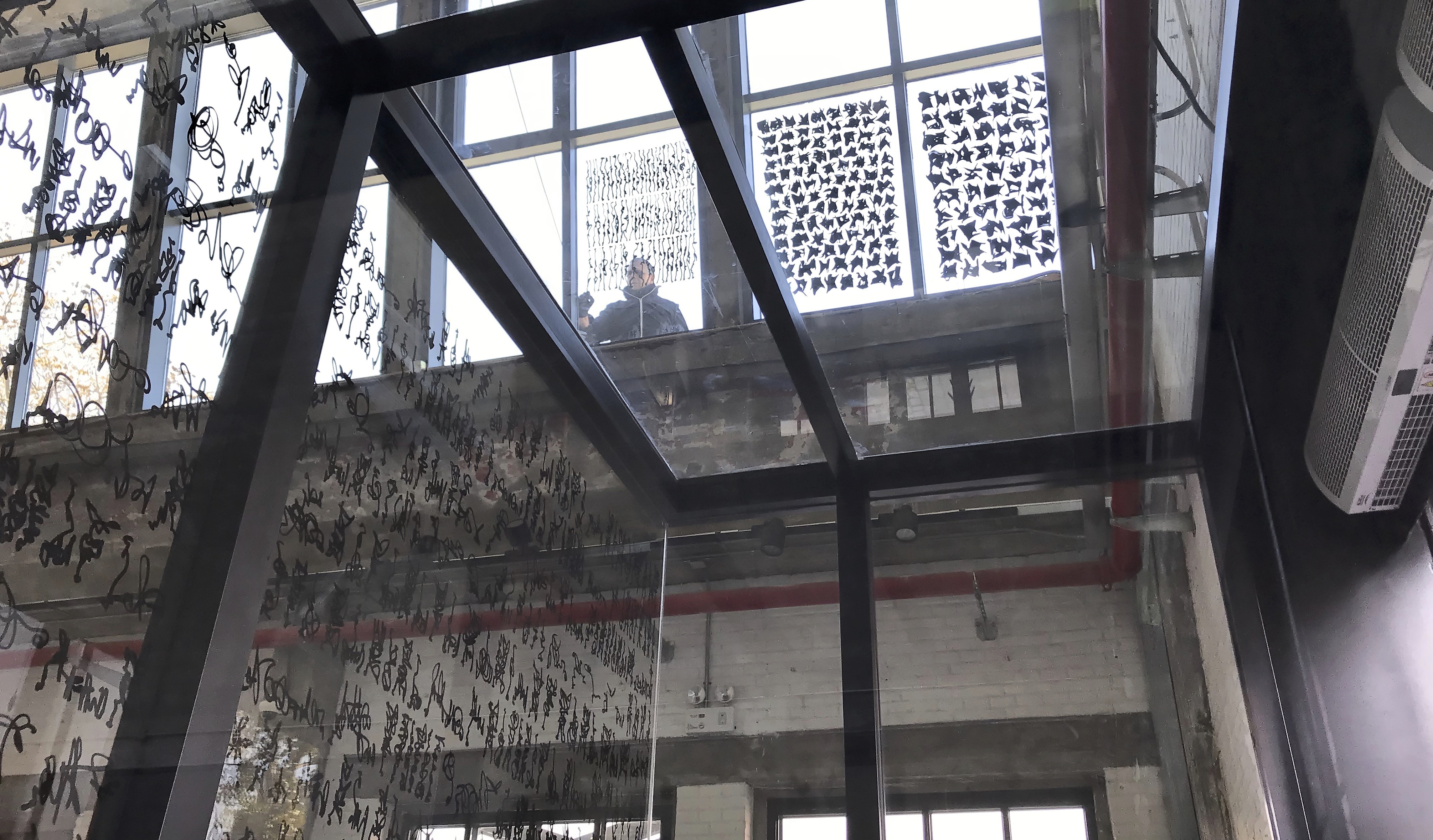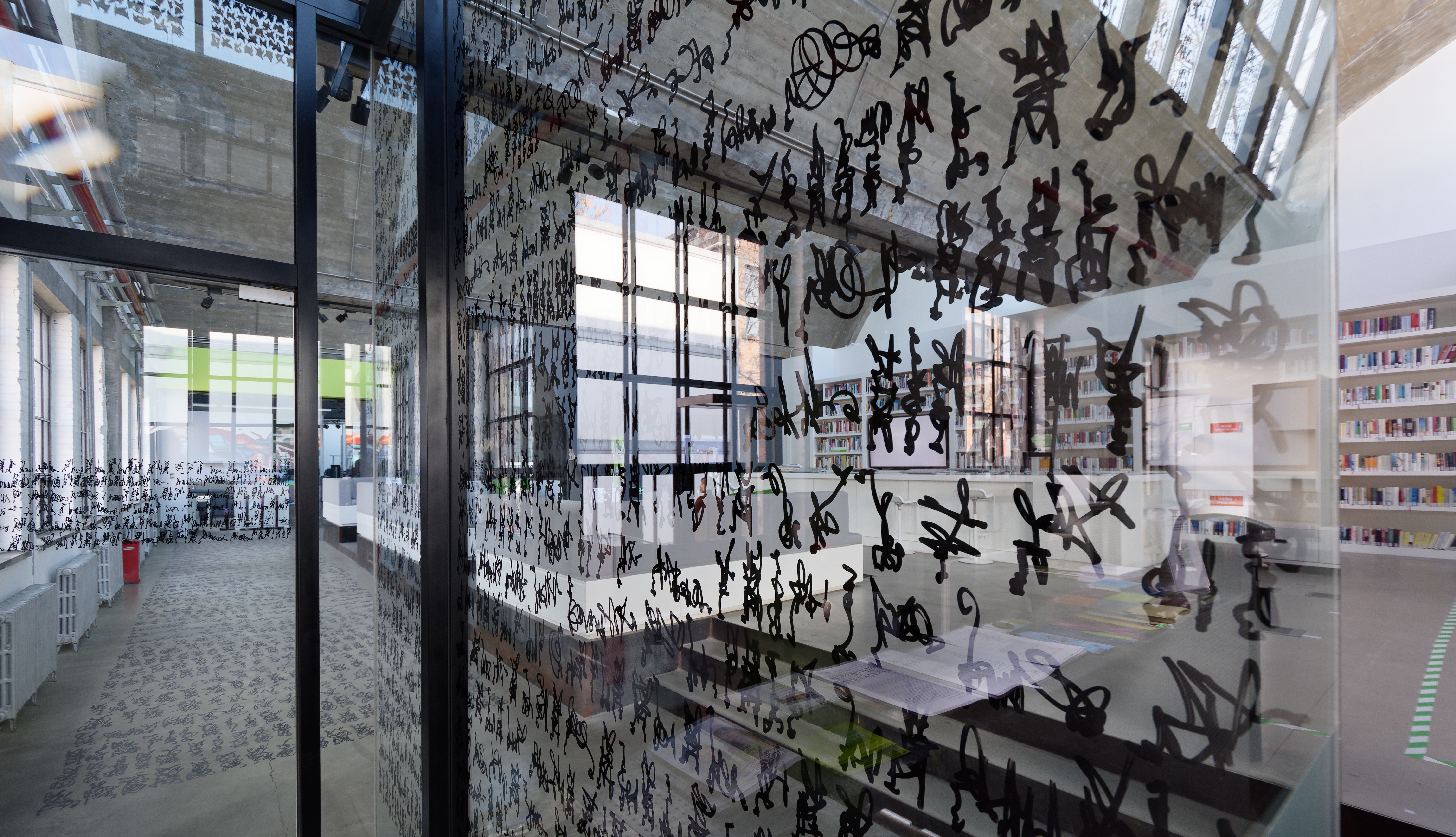 Haupteingang Goethe Institut Zeichen, Vektordatei, Folie auf Glas, zweispaltig, je 300 x 45 cm, 2018 Podiumsgespräch Schreiben, Form und die Bedingungen und Grenzen von Bedeutung, 24/11/2018, Foto: Andreas Wistoff Schreib-Performance, Eingangsbereich, 17/11/2018, Foto: LI Yinyun, Goethe-Institut (China) Schreib-Performance, obere Fensterfront, 22/11/2018 Foto: Norbert Fuhr Bodentext, elektronisches Schreibtablett, Foliendruck auf Beton, 14 x 3 m , 2018 Stelen, Acryl auf Leinwand, je 230 x 50 cm, 2018 Eingangsbereich der Bibliothek