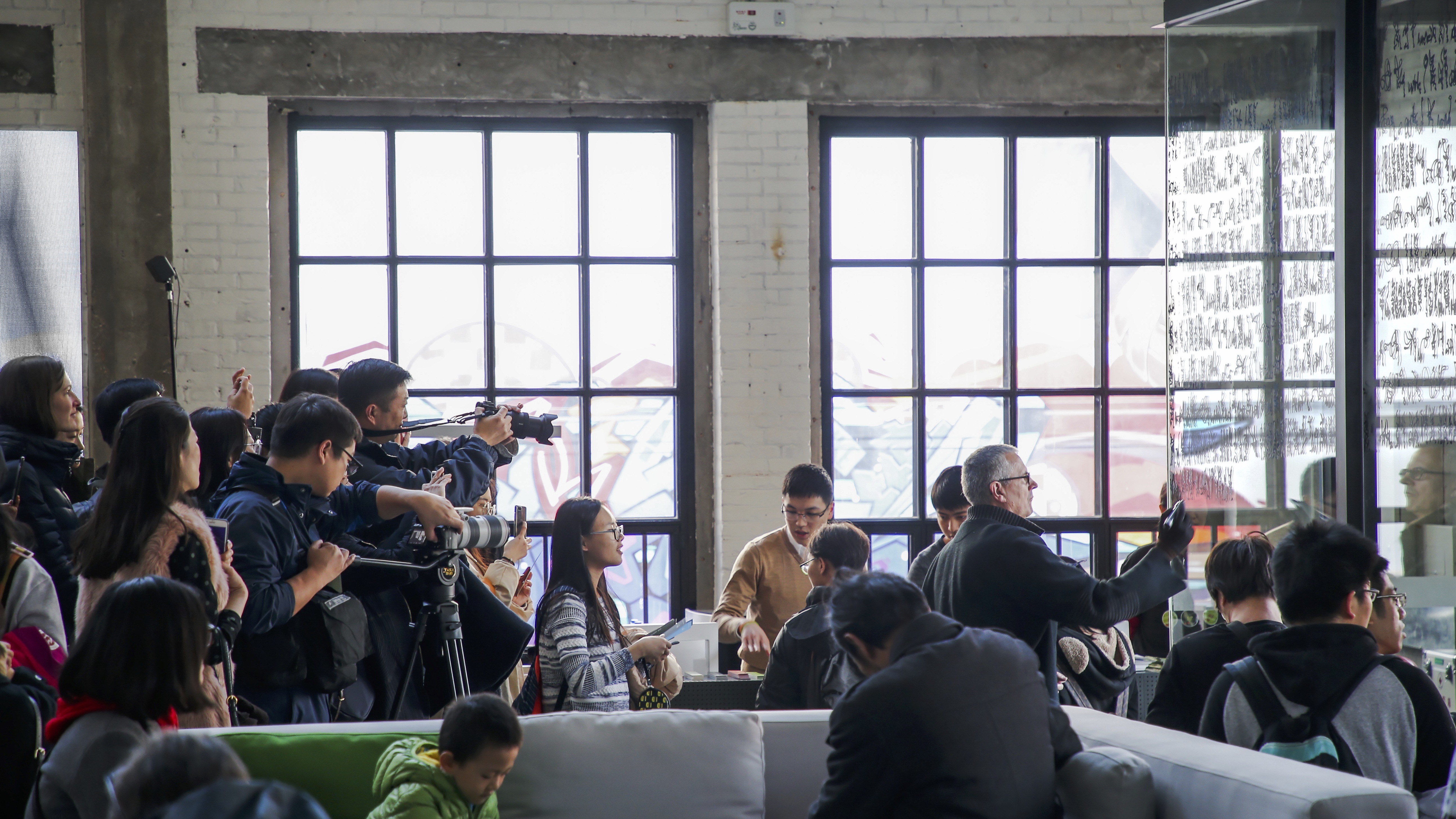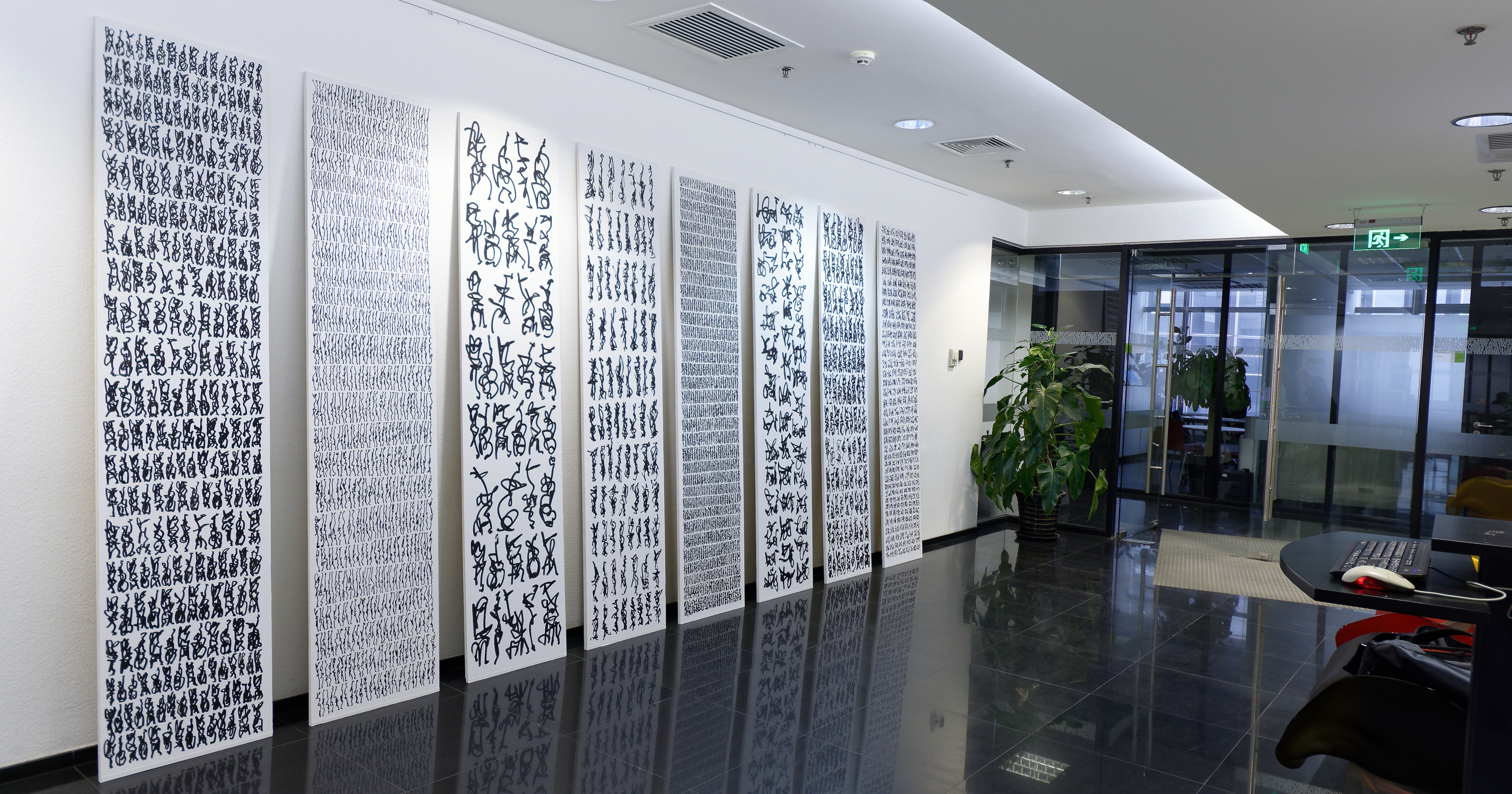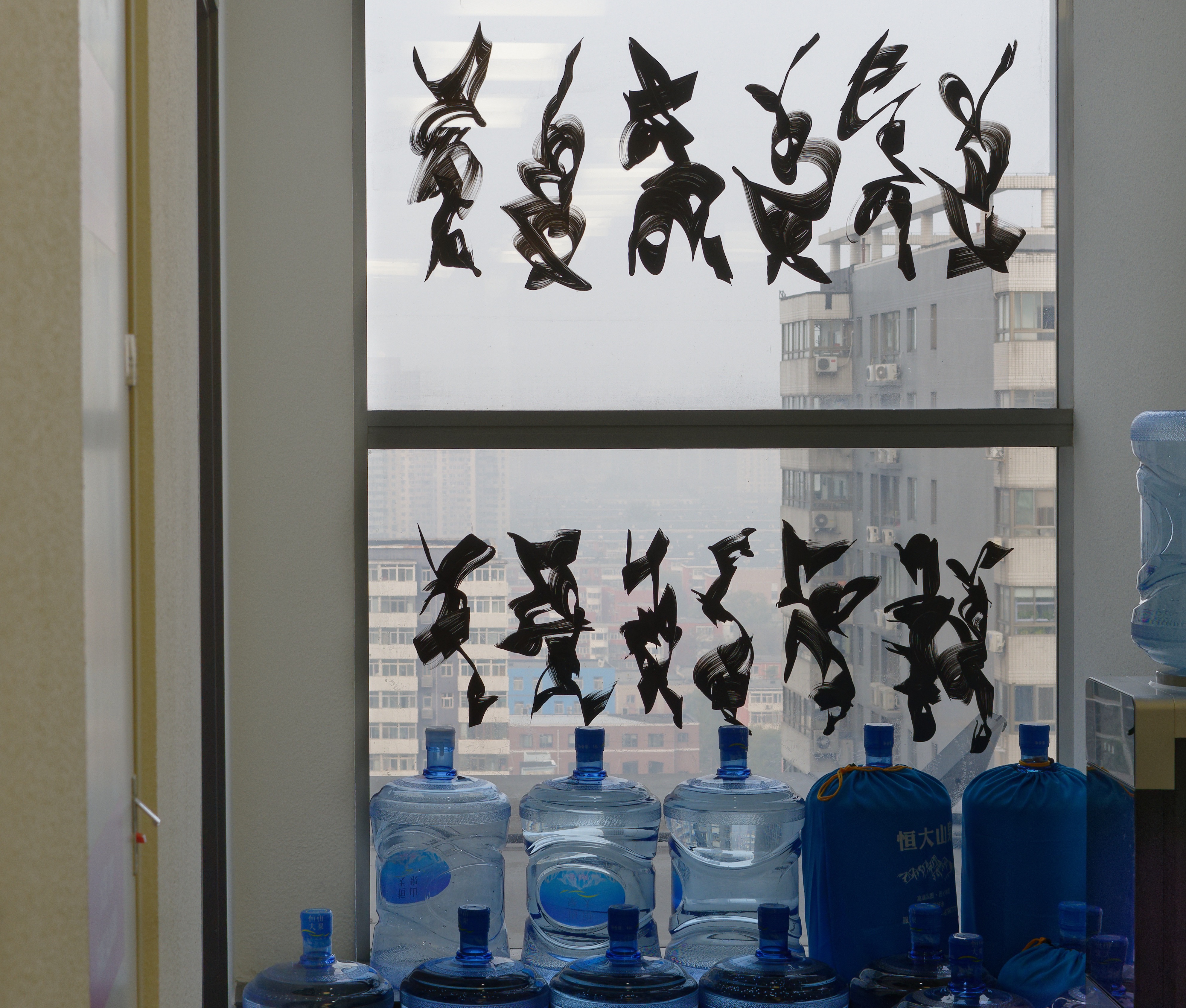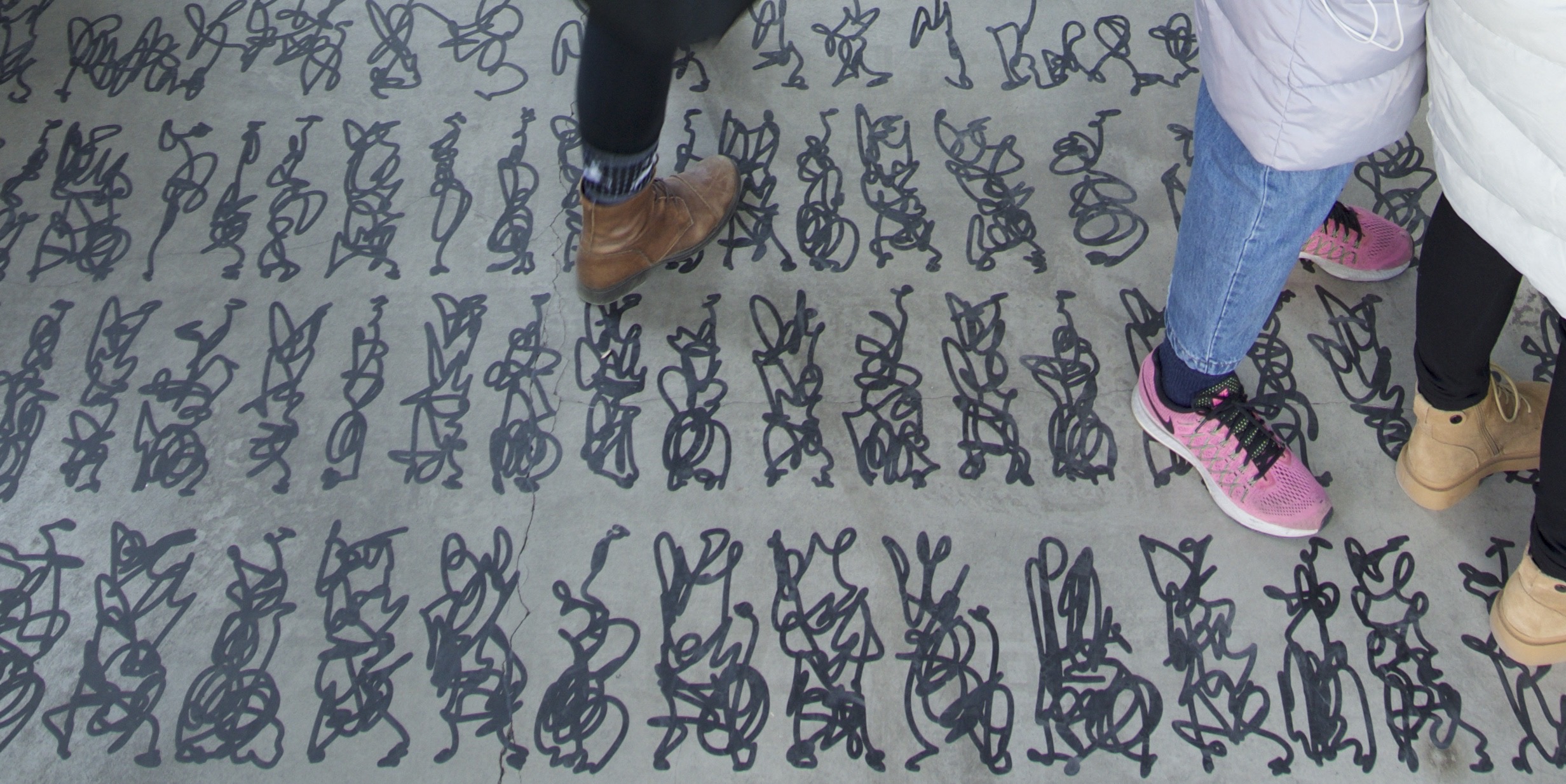 Haupteingang Goethe Institut Zeichen, Vektordatei, Folie auf Glas, zweispaltig, je 300 x 45 cm, 2018 Podiumsgespräch Schreiben, Form und die Bedingungen und Grenzen von Bedeutung, 24/11/2018, Foto: Andreas Wistoff Schreib-Performance, Eingangsbereich, 17/11/2018, Foto: LI Yinyun, Goethe-Institut (China) Schreib-Performance, obere Fensterfront, 22/11/2018 Foto: Norbert Fuhr Bodentext, elektronisches Schreibtablett, Foliendruck auf Beton, 14 x 3 m , 2018 Stelen, Acryl auf Leinwand, je 230 x 50 cm, 2018 Eingangsbereich der Bibliothek