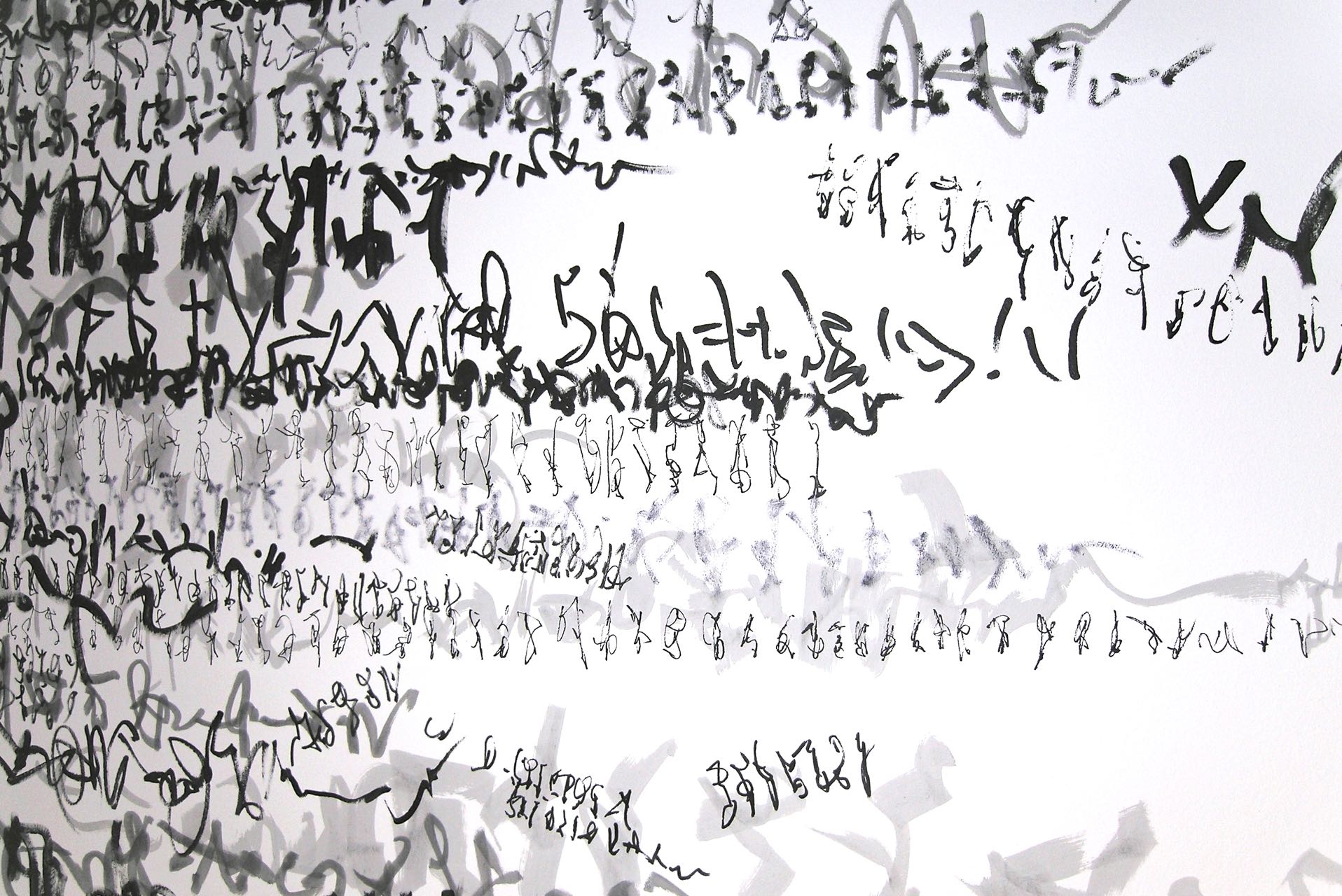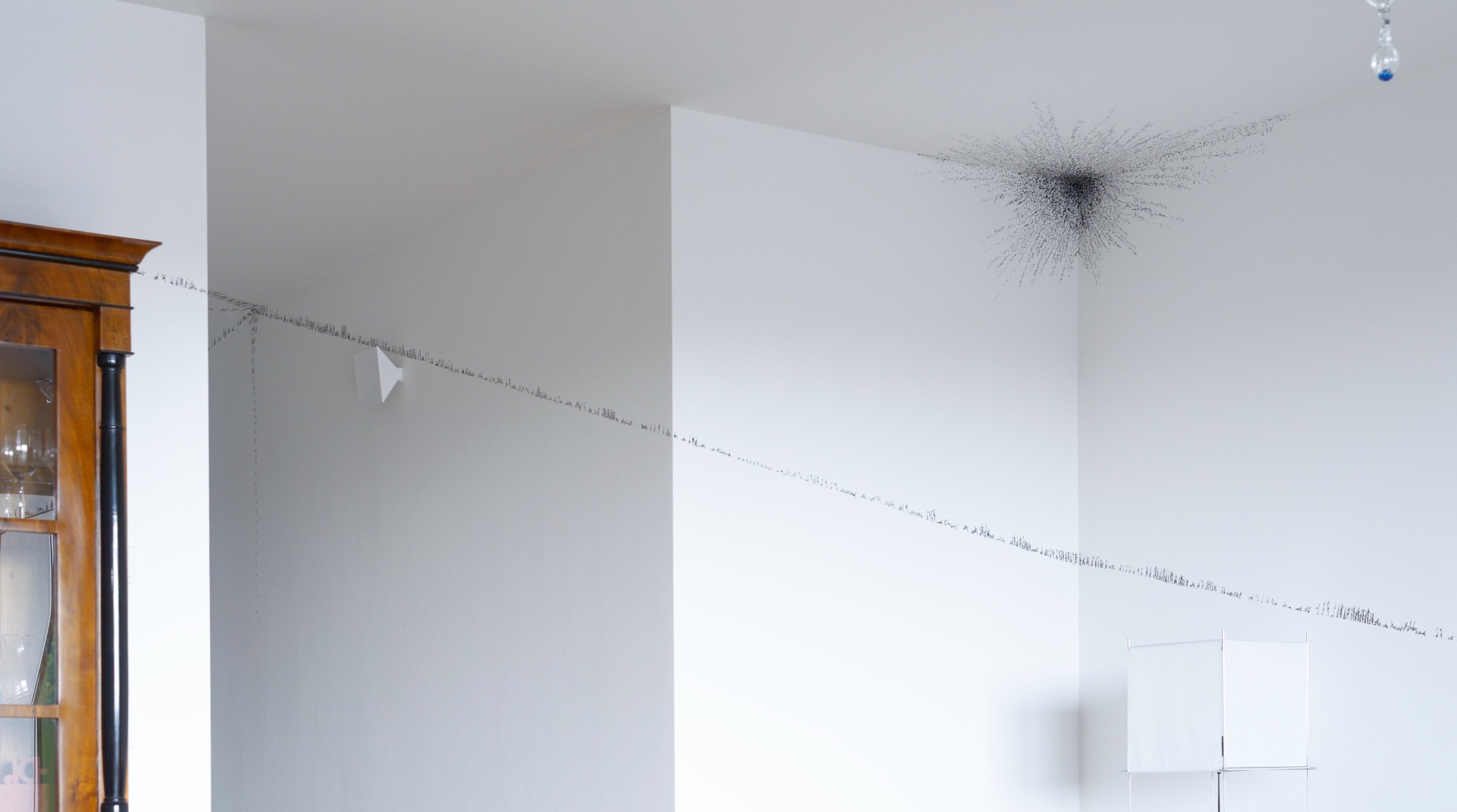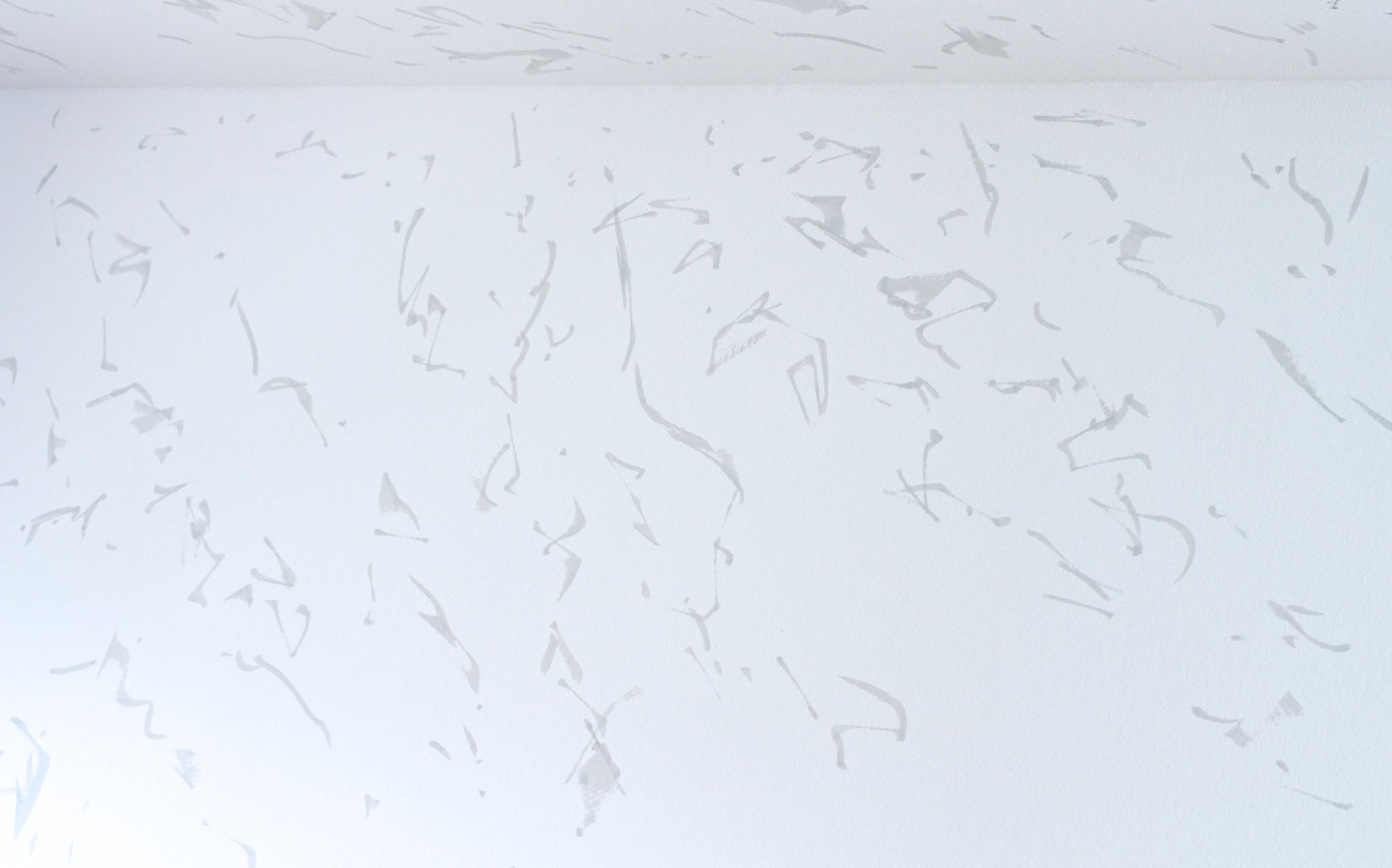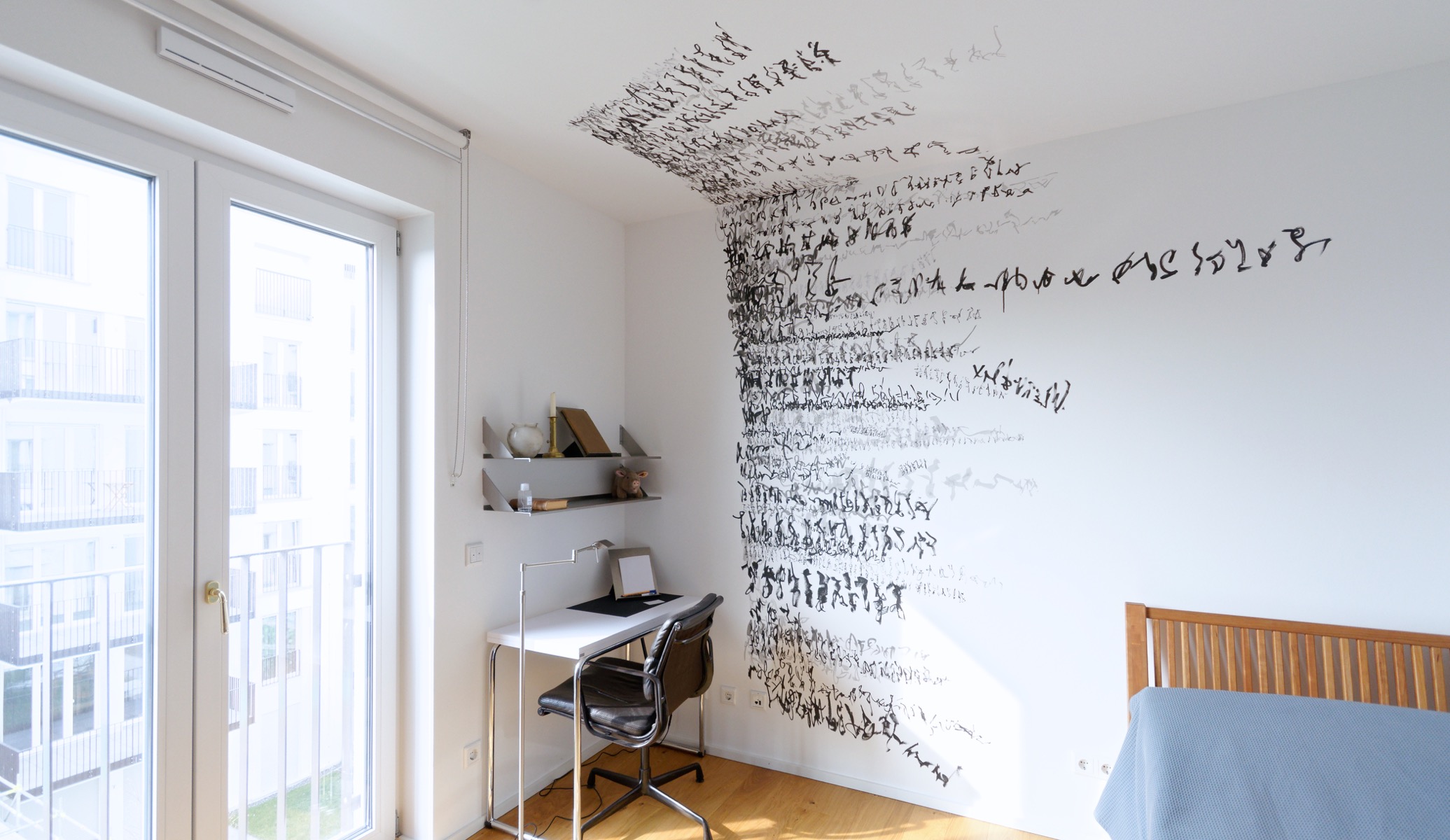 Zeichen wandern ameisenähnlich über gegenüberliegende Wände, so dass sie sich – von einem bestimmten Punkt aus betrachtet – zu einer Geraden zusammenschließen, indem sie den Raum zwischen den Wänden zu überspringen scheinen. Zeichennester konterkarieren Raumecken. Die Zeichenreihen verlaufen diagonal und so zu dem vertikal/horizontal strukturierten Raum in Opposition. Der Sprung der Zeichen, die Vernichtung der Raumecken und die schräg verlaufenden Zeichenreihen schaffen räumlich einen Zusammenhang, einen auf den Realraum bezogenen Schriftraum. Sie bilden im Realraum einen eigenen, rein optischen Schriftraum. (Burkhard Brunn, Katalog: Axel Malik – Raum im Raum, Frankfurt,2015)