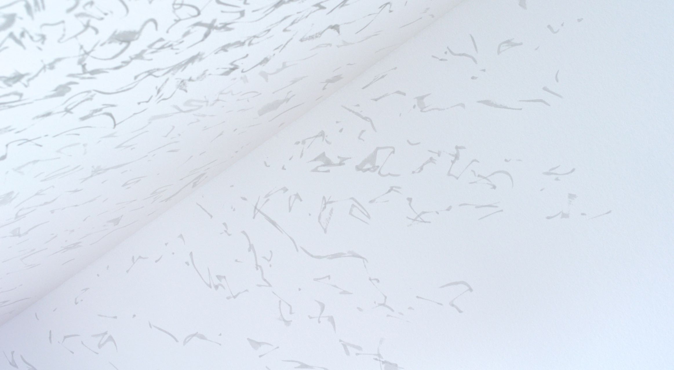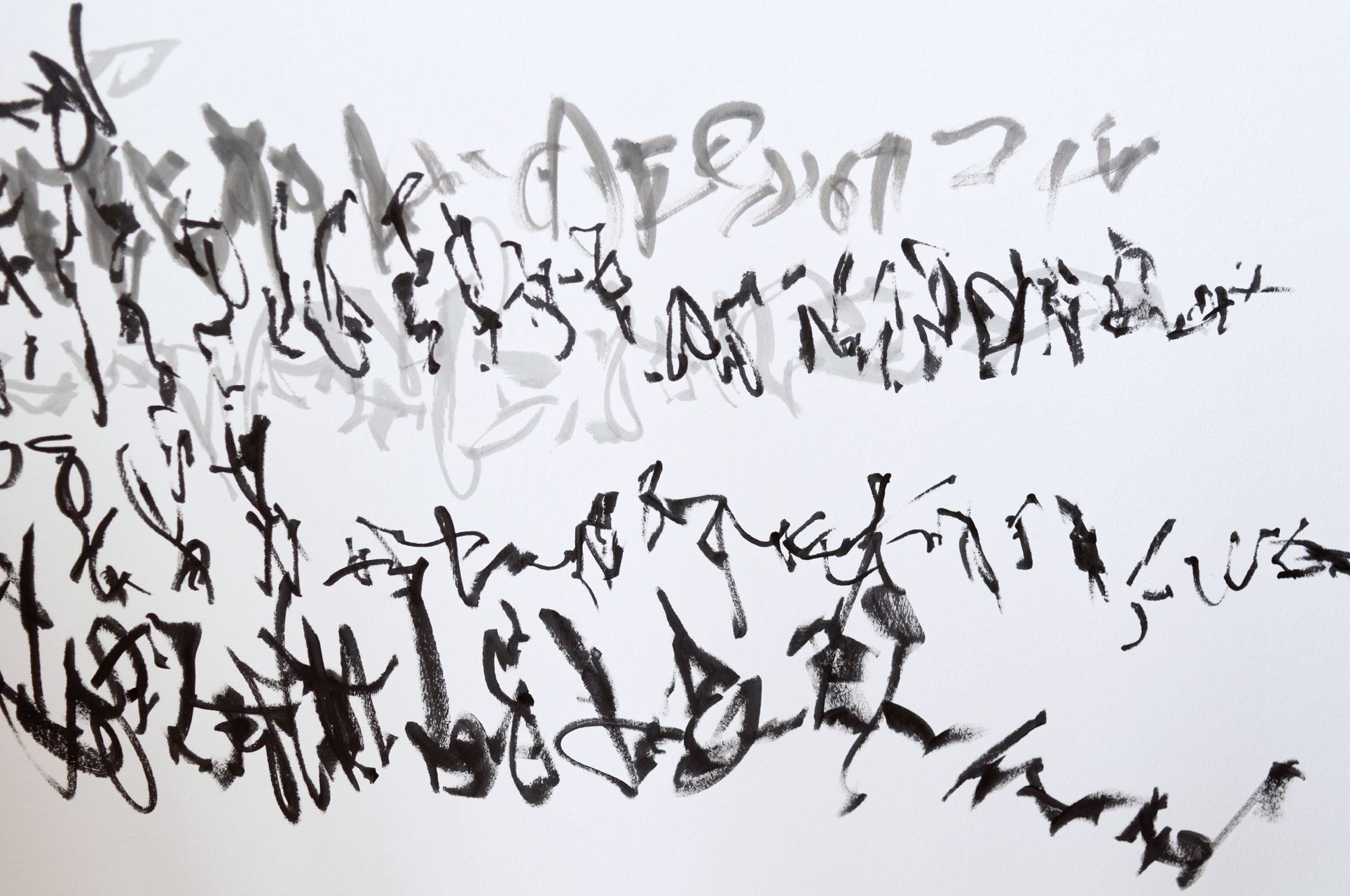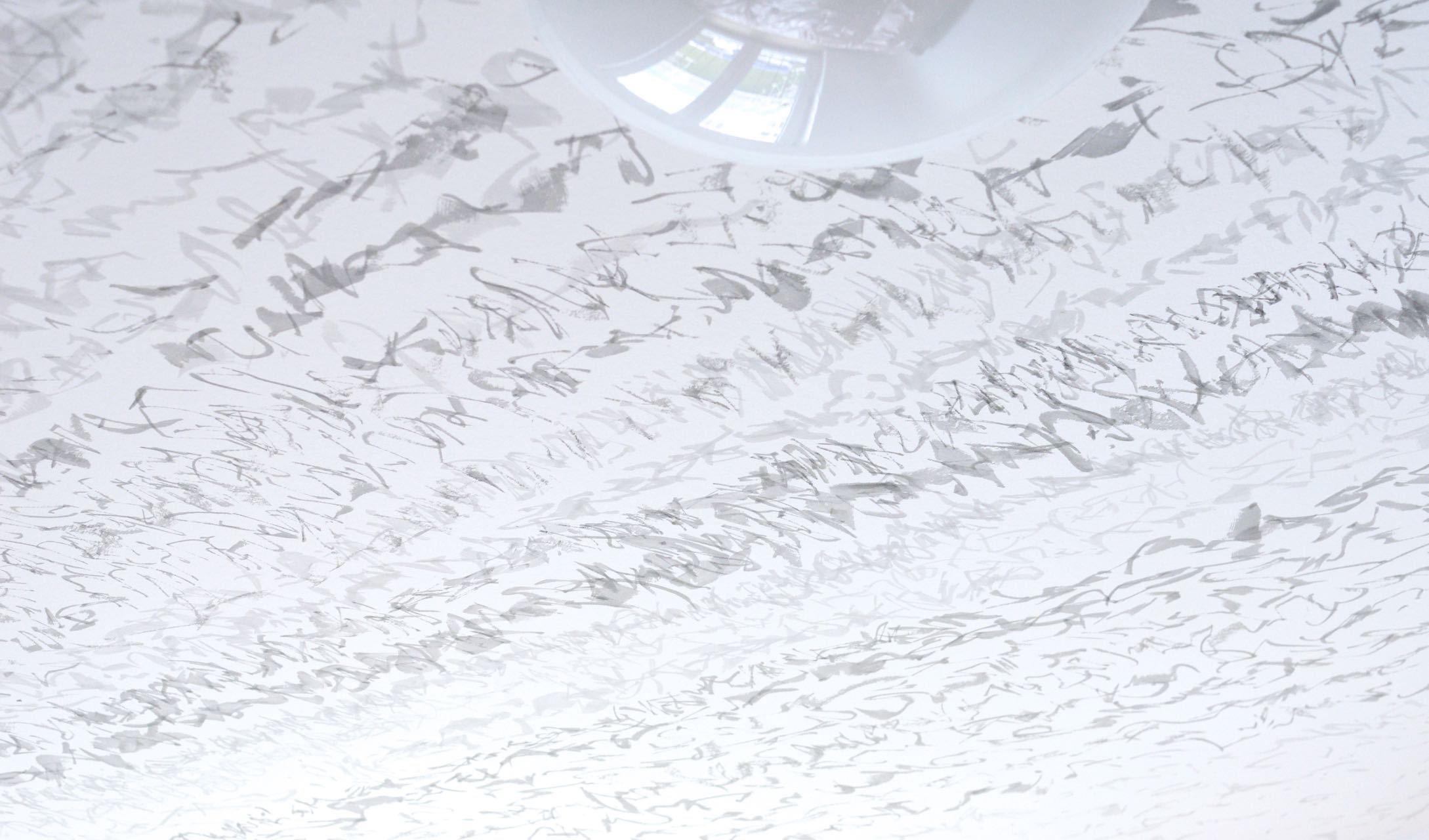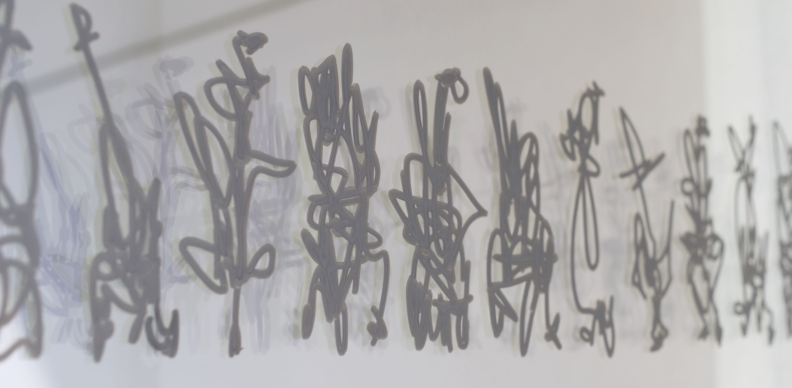Zeichen wandern ameisenähnlich über gegenüberliegende Wände, so dass sie sich – von einem bestimmten Punkt aus betrachtet – zu einer Geraden zusammenschließen, indem sie den Raum zwischen den Wänden zu überspringen scheinen. Zeichennester konterkarieren Raumecken. Die Zeichenreihen verlaufen diagonal und so zu dem vertikal/horizontal strukturierten Raum in Opposition. Der Sprung der Zeichen, die Vernichtung der Raumecken und die schräg verlaufenden Zeichenreihen schaffen räumlich einen Zusammenhang, einen auf den Realraum bezogenen Schriftraum. Sie bilden im Realraum einen eigenen, rein optischen Schriftraum. (Burkhard Brunn, Katalog: Axel Malik – Raum im Raum, Frankfurt,2015)